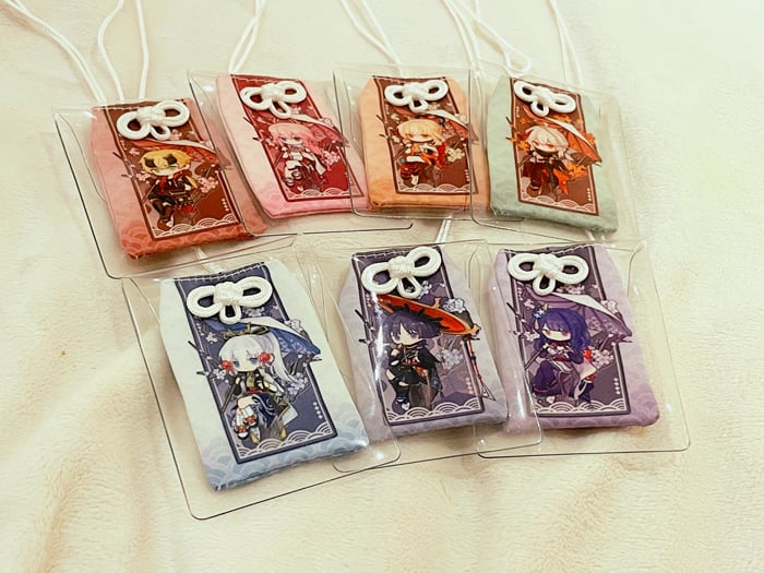 This is a pure handmade Yae Miko Japanese style amulet (Omamori) made with silky peach skin fabric~Each amulet comes with a plastic packet that protects it from getting bent during shipping. The size of each amulet is around 6-7cm each. The pocket inside is open and seal-able so you can put your most precious items inside :D
