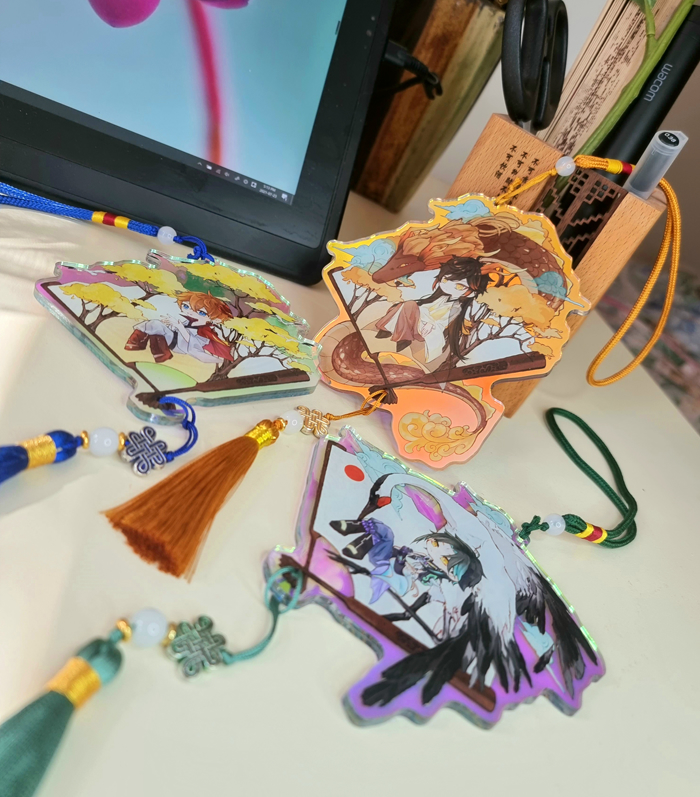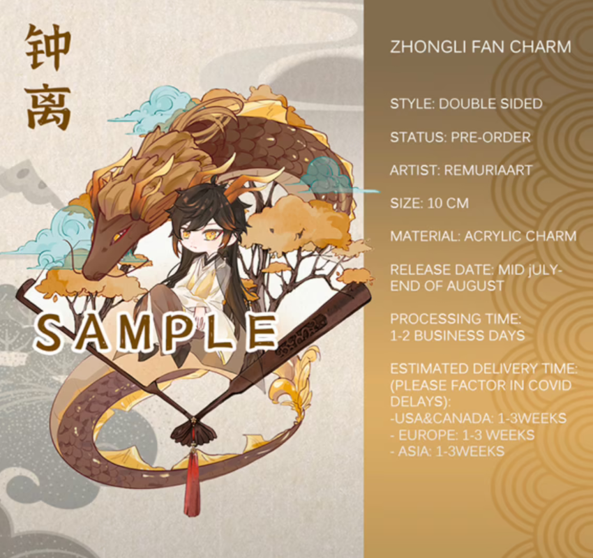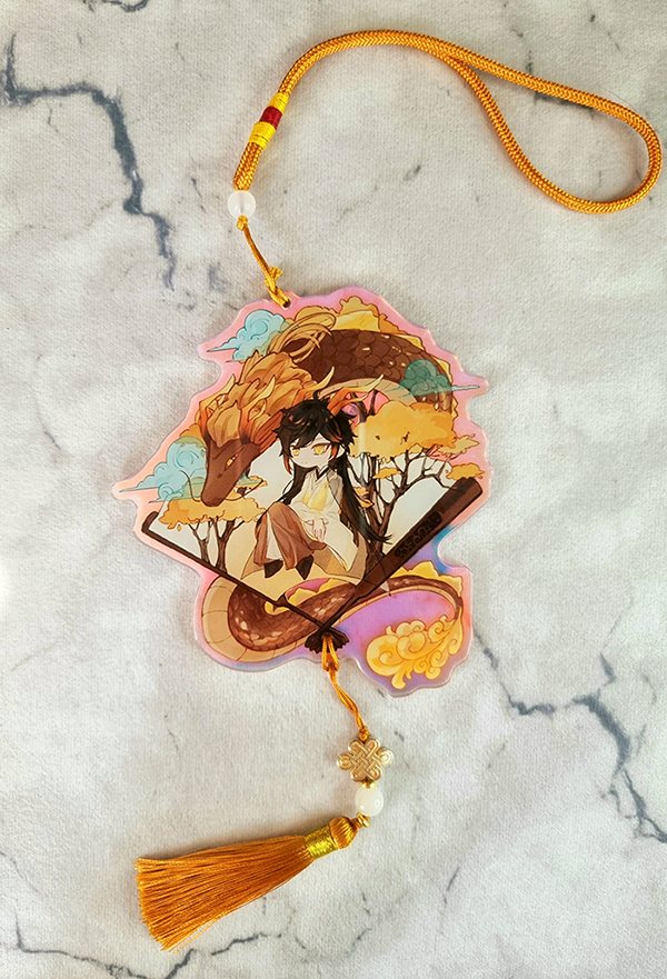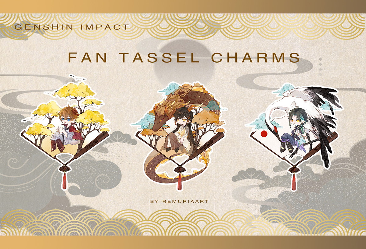 Classy acrylic charms of fan faves Zhongli, Xiao, and Childe with an alternate oriental twist. Each charm comes with an actual tassle that is much bigger than the concept art. Pre-order these one-of-a-kind charms now!